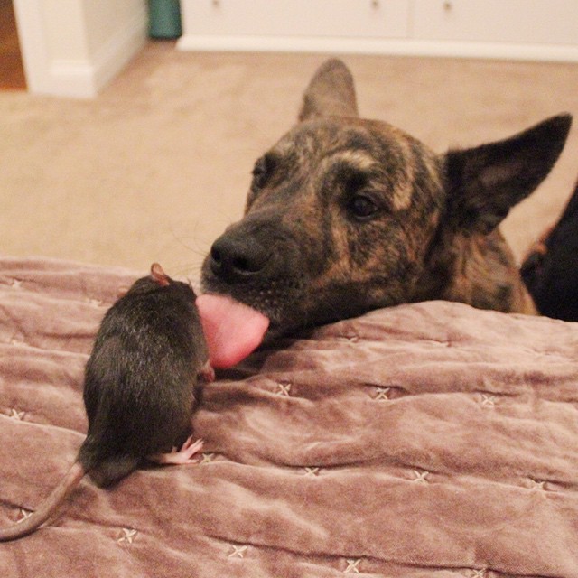 ▼剛開始Osiris接近Riff Rat時,主人非常擔心,就怕狗狗將老鼠吃掉,畢竟牠們的體型相差太大了。但Osiris非常溫柔,小老鼠也不怕這個大朋友。