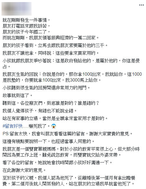 ▼於是單親媽媽怒回,「你說是你的,那你拿1000出來,我就給你,這1000是我墊的,你要就拿1000出來,我3000馬上給你!」小孩聽到氣到甩門離開。於是原PO想問網友們認為到底哪一方是對的?哪一方是錯的?這貼文一曝光立刻就掀起網友們的熱議,網友的看法立場十分兩極化。