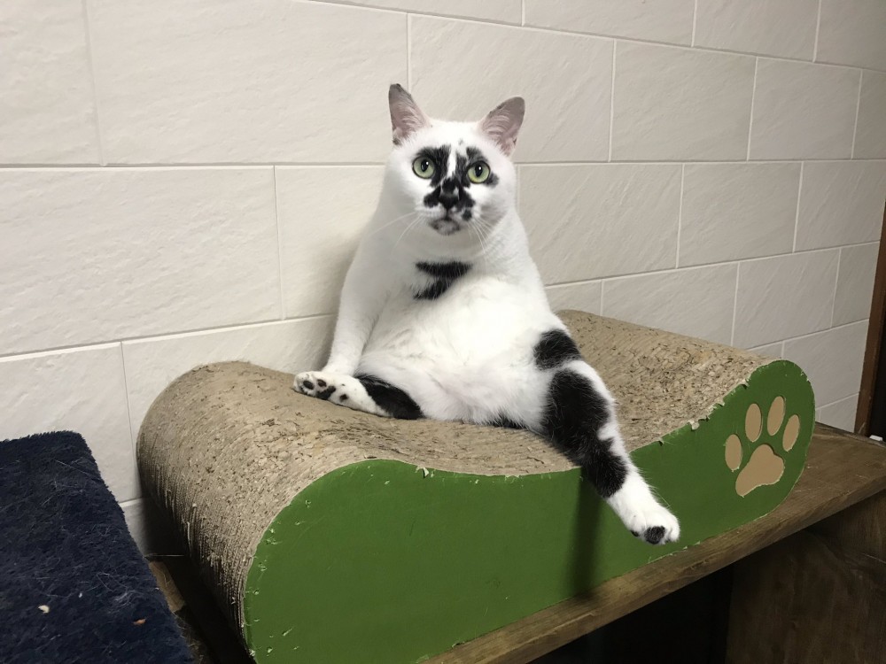 ▼這3隻貓咪當中有一隻叫Michiru的最特別,這隻貓咪全身大部分的毛毛都是白色的,只是臉上、胸前、身上有一些黑色的花紋,看起來就像沾了墨水一樣。
