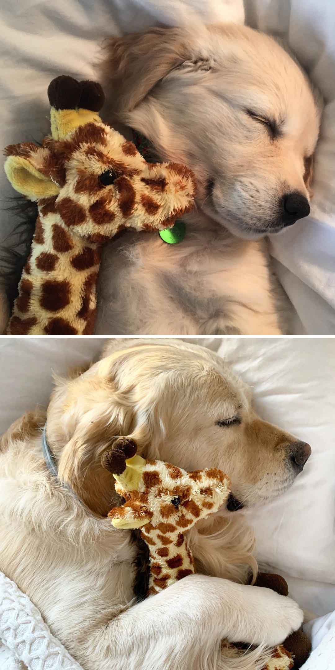 ▼「我家狗狗和牠最愛的玩具,過去 vs 現在。」
