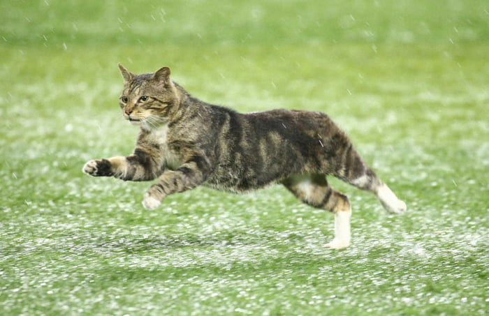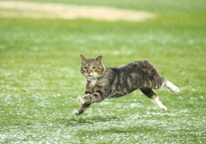 ▼這隻虎斑貓不知道怎麼來到球場中,因為球場邊緣的區域有高高的軟墊,牠一時之間找不到出口,只能在球場上狂奔。當時球賽剛剛結束,一位體育攝影師發現貓咪後拍下了牠帥氣奔跑的英姿。