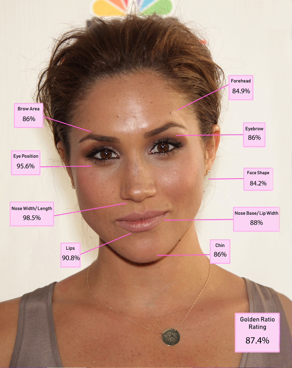 ▼第4名:87.4%,薩塞克斯公爵夫人梅根王妃,被評為有著完美的鼻子形狀和臉型,之所以可以脫穎而出是因為她有著完美的臉部對稱,在鼻子的形狀評比更拿到了98.5%的高分,下巴是許多人夢寐以求的V形下巴,所以平均下來位居第四。