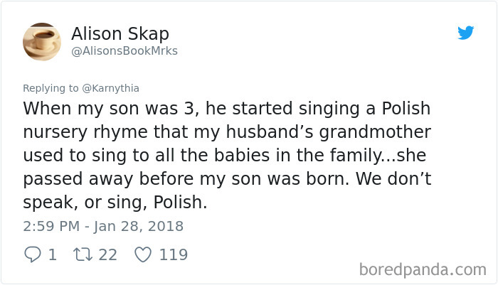 ▼「我兒子3歲時突然用波蘭文唱我老公的阿嬷以前對著家裡小孩唱的兒歌…但她在我兒子出生前就離開世界了。我們不會講波蘭文,更不會用波蘭文唱歌。」