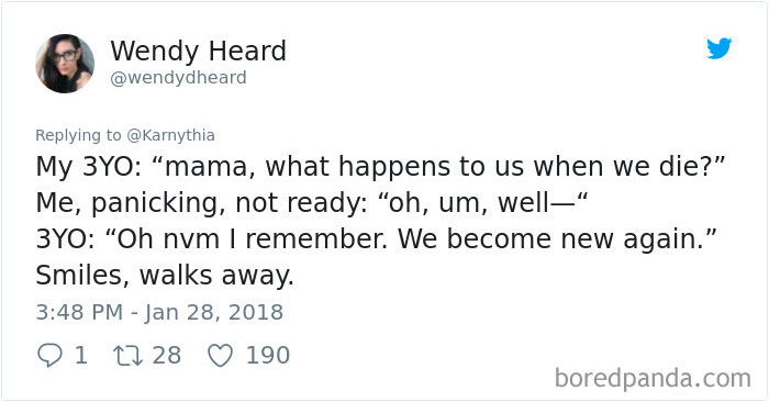 ▼「我的3歲小孩:『媽媽,我們離開世界後會怎樣?』我有點害怕,不知如何回應:『噢,痾,那個…』3歲小孩:『算了沒事,我還記得。我們會再次變成新的。』然後他微笑著走開了。」