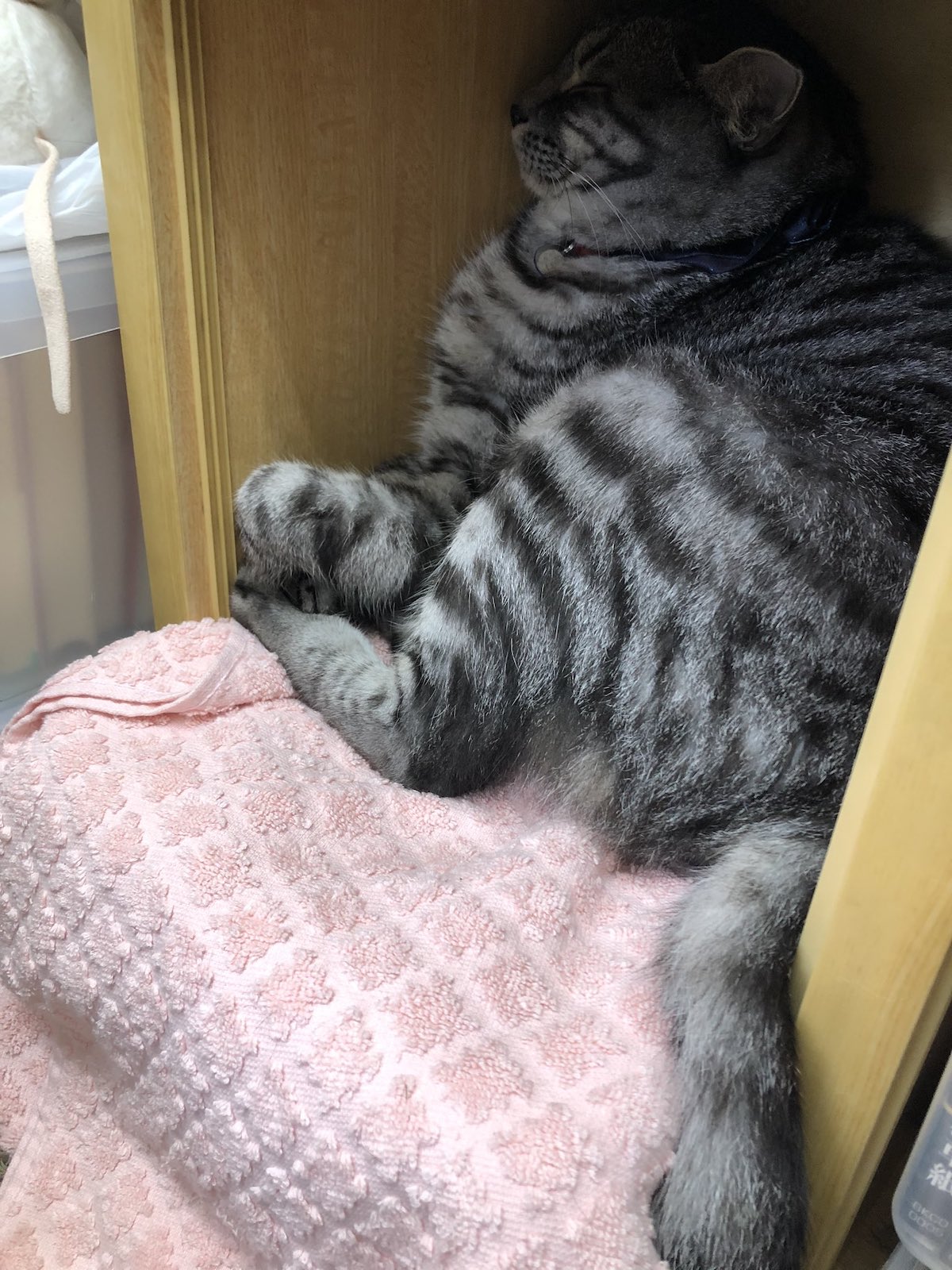 ただ本日は棚の中で寝ているのではなく、バズった影響から密を避けて自粛だそうです!