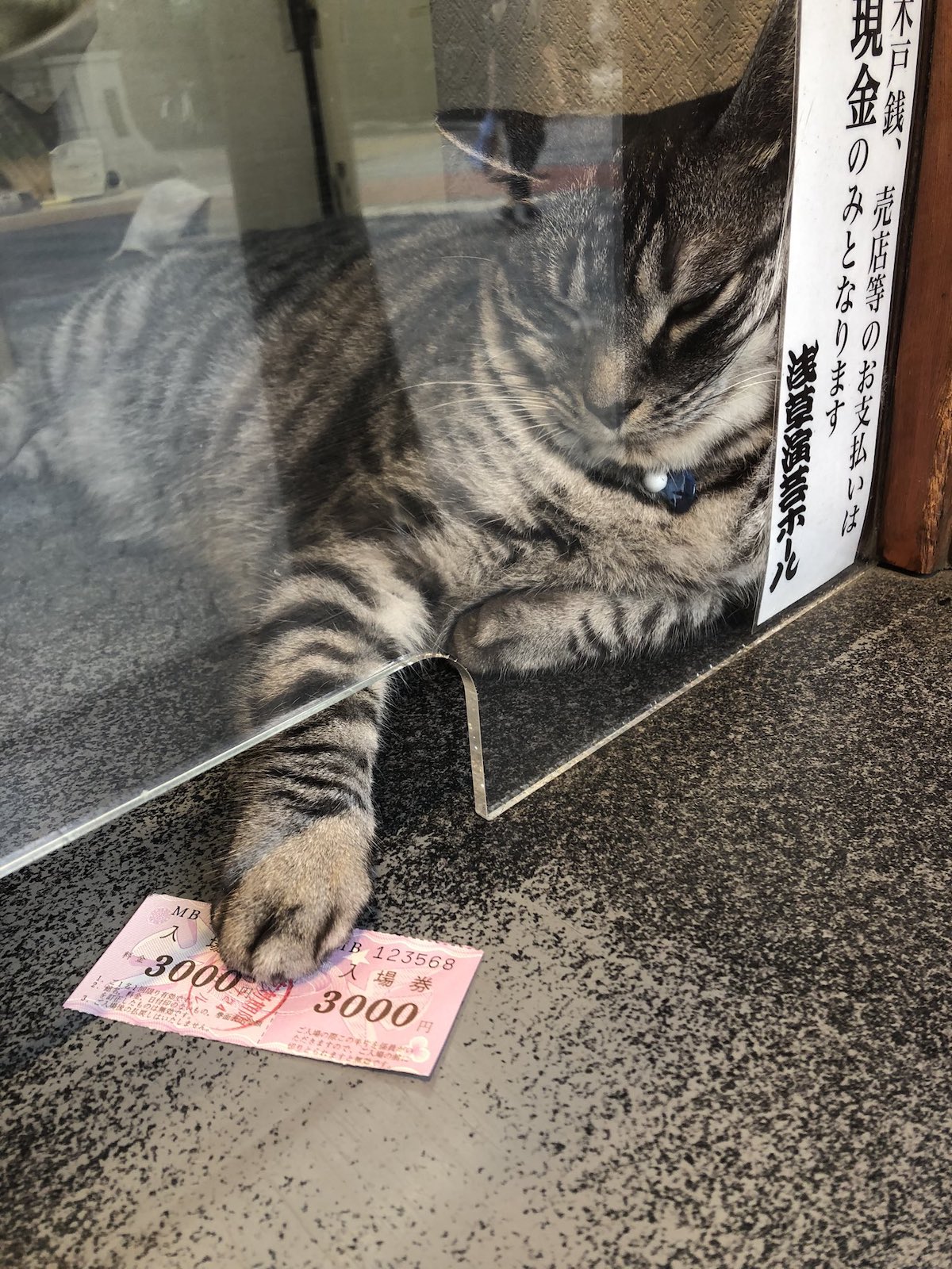 ▼日本落語家桂三木助在推特分享了淺草演藝廳這隻「看板貓」Girori的慵懶賣票之姿,在賣票窗口用前掌推出入場券的可愛畫面,引起了網友們的熱絡分享按讚,更釣出了許多的貓奴觀眾,紛紛表示也很想被Girori服務!