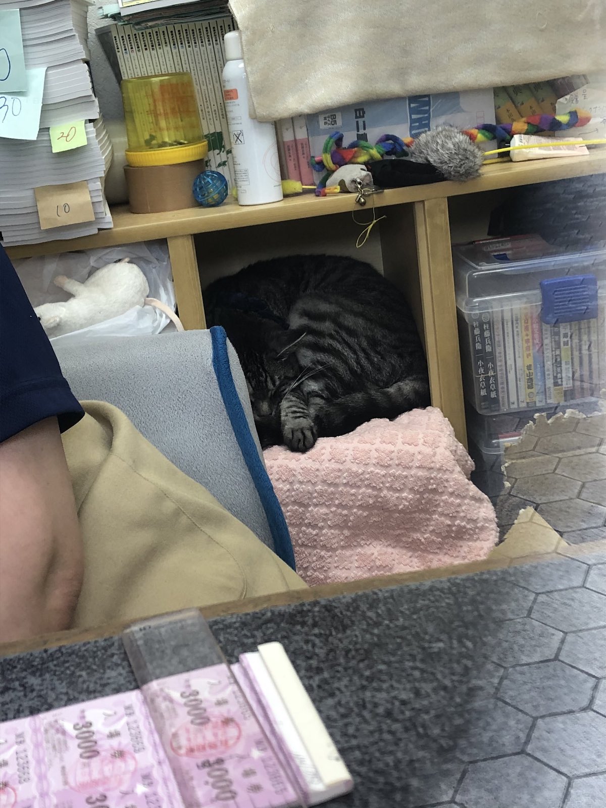 ▼但是想要跟Girori買到票也需要靠運氣的,因為平時如果沒看到Girori的話,那牠肯定是在哪裡睏覺,例如正躲在櫃子裡面呼呼大睡的Girori,但是睡著時,Girori仍然是隻十分盡責的招財喵咪。