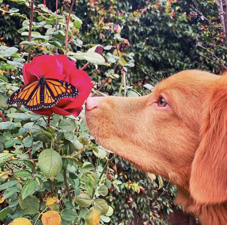2020年07月28日狗狗擁有接近7歲小朋友的智商,牠們善解人意,和很多動物都能建立跨物種的友誼,甚至是和昆蟲!國外有隻狗狗米洛(Milo)從小就和媽媽珍.本內特(Jen Bennett)一起在花園中忙進忙出,兩年前珍開始飼養君主斑蝶,米洛也參與了蝴蝶從幼蟲到蛹,再到變成蝴蝶的整個成長過程,毫不介意蝴蝶們停在自己身上休息~