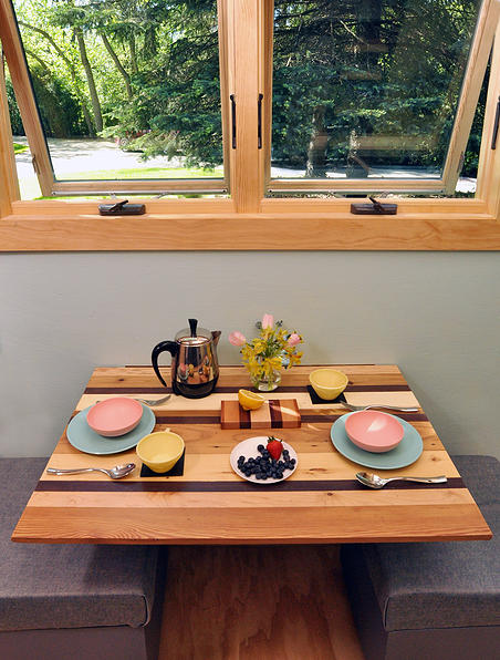 ▼沙發是由8張可以各自活動的儲藏椅所組成,可以隨需要組成小餐桌或是排成一長條沙發,自由度很高。廚房裡的小餐桌也是採可以折疊式的,全套木製的內裝配色,看起來很舒適。