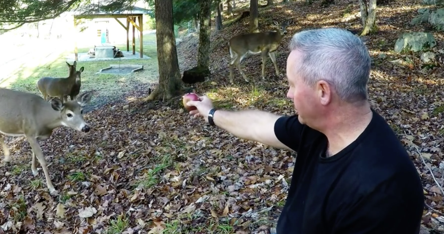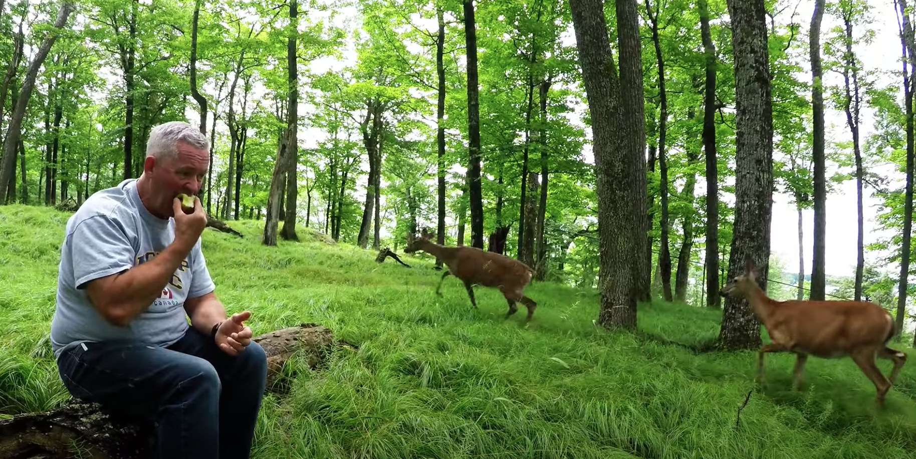 2020年07月30日加拿大安大略省南部有一片寧靜的森林,因為不允許狩獵,所以生活在這裡的小鹿對人類沒有戒心。一名男子在森林中吃蘋果時引起了小鹿的注意。小鹿跑來討食,他大方跟小鹿們分享,那寧靜、和諧的畫面讓人覺得很療癒。