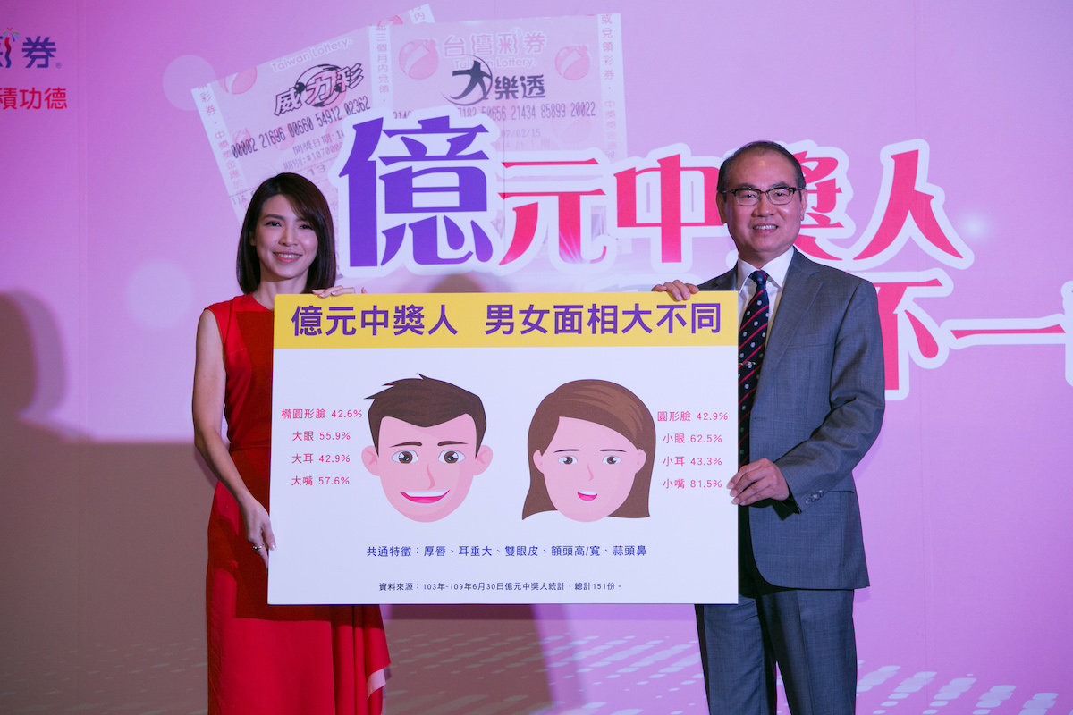 ▼台灣彩券舉辦了「億元中獎人 男女不一樣」的記者會,根據台彩公司統計,從2014年以來至今年6月,151位億元中獎者當中,男生有116位、女生有35位,男、女佔比各是77%和23%。台彩總經理蔡國基指出,男、女中獎人特徵有明顯不同,男生多半長相大器,大眼睛(55.9%)、大嘴巴(57.6%)、大耳朵(42.9%);女生中獎人則是秀氣五官居多,小眼睛(62.5%)、小嘴巴(81.5%)、小耳朵(43.3%)。