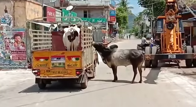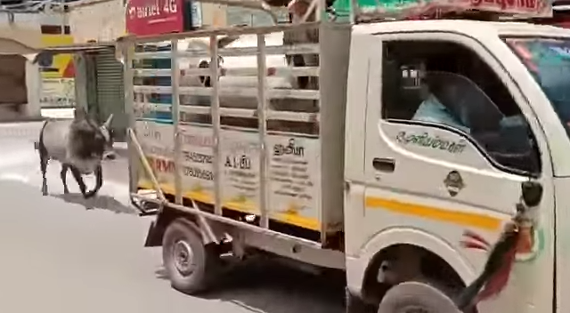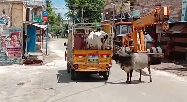 ▼原來Muniyandi家附近寺廟供養的一頭公牛,和這頭母牛感情很好,因為看到母牛要被貨車給載走了,便跟在貨車旁,兩隻牛離情依依,公牛在貨車邊轉來轉去,看得出牠們情感真摯,而在小貨車驅車加速駛離後,公牛竟也開始拔腿狂奔,緊追在載母牛的貨車後面,據當地民眾表示,公牛一路追了1公里之遠。