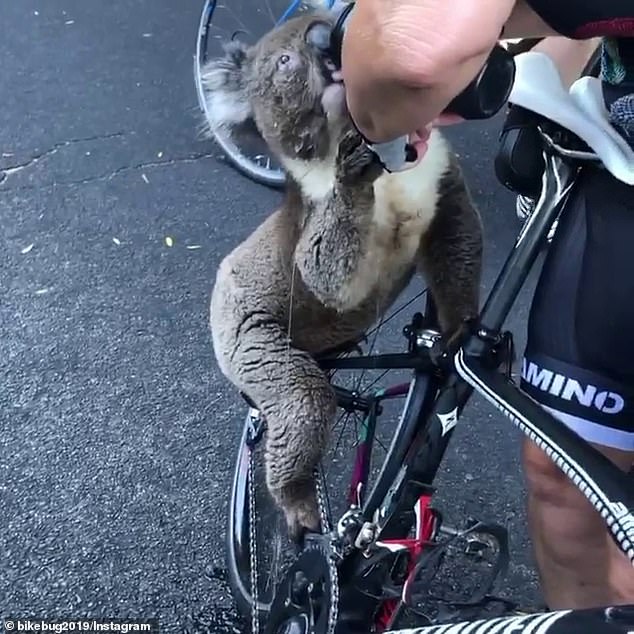 ▼看到Anna拿出水來,無尾熊主動爬上自行車,牠的速度非常快,顯然很口渴。接著牠抱起水瓶,迫不及期待喝起水來。