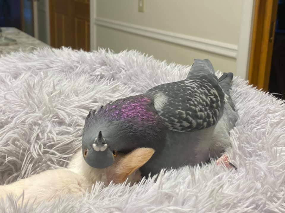▼那天晚上Rogers要照顧Lundy,她將Herman放在Lundy的小床邊,方便同時照看這兩個小傢伙。沒想到鴿子和狗狗很快親近起來,就像多年未見的老朋友。Rogers覺得很有趣,拍攝照片po到臉書上,結果引發大討論。