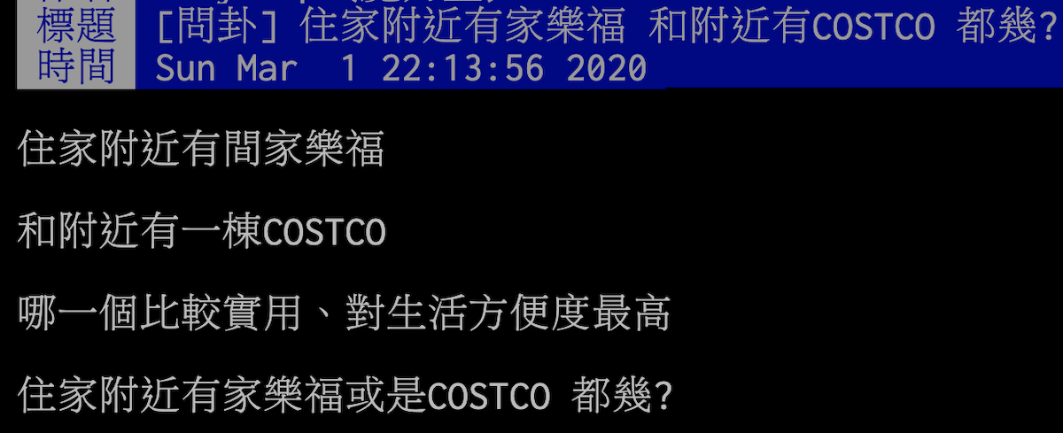 ▼原PO在PTT的八卦版上發文,表示住家附近有間家樂福或是好市多,「哪一個比較實用、對生活方便度最高」,想知道網友們的看法。文章引起PTT上網友們的熱烈討論。