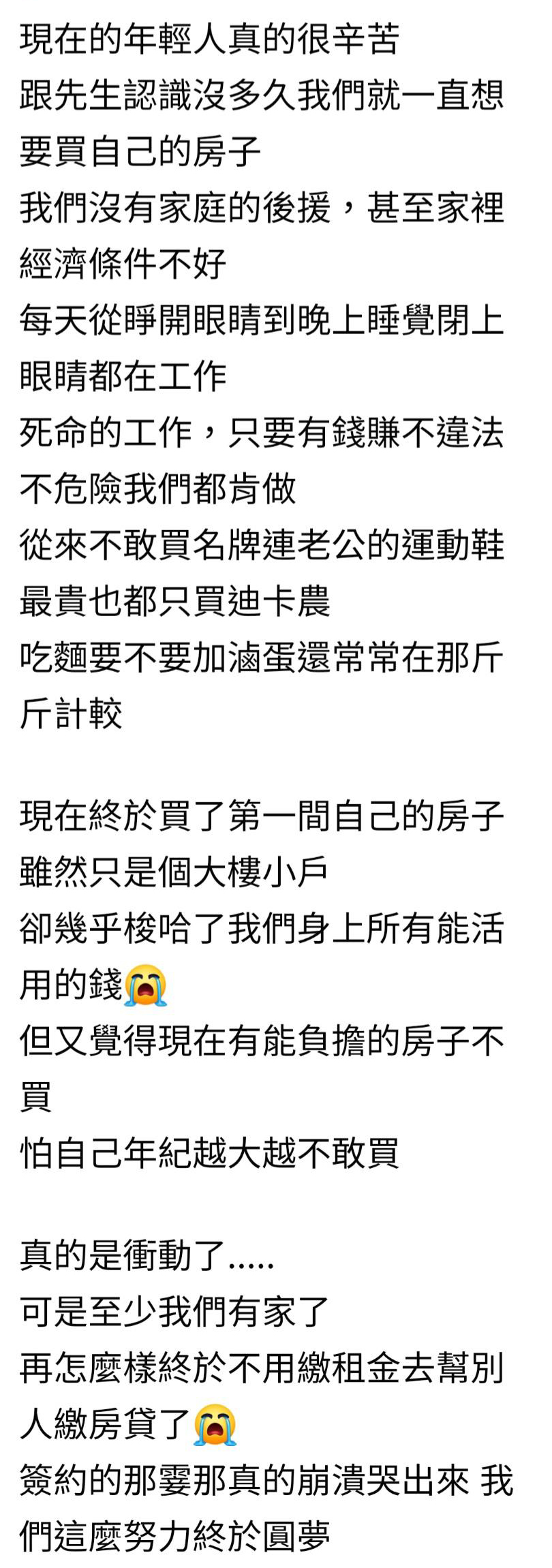 ▼PO文一發出後,有許多網友都紛紛熱議,有人獻上祝福,「現在買是對的,很替你們開心」、「恭喜,買房真的是要一股衝動,買了之後就不用擔心將來老了不好租房」、「有自己房子真的很好,再辛苦都值得了」、「給你們夫妻一個讚」、「辛苦了,願你們日後會如倒吃甘蔗,越來越甜」。