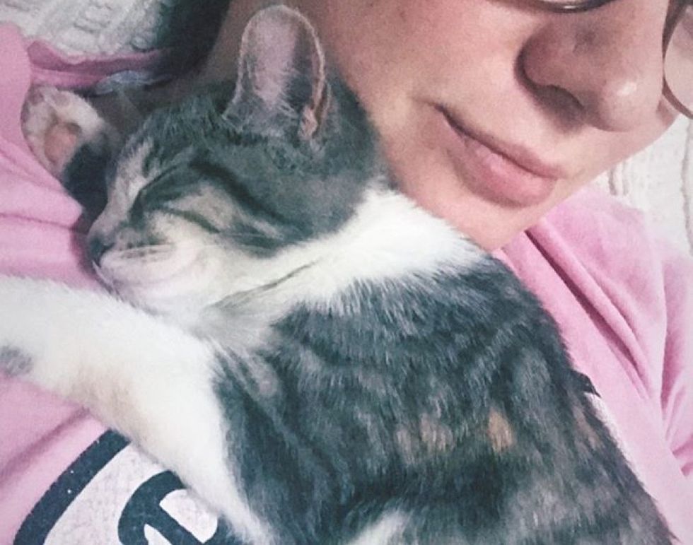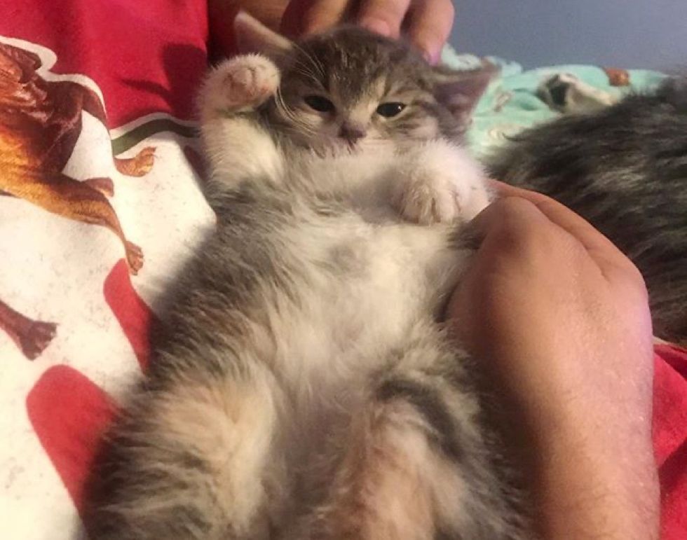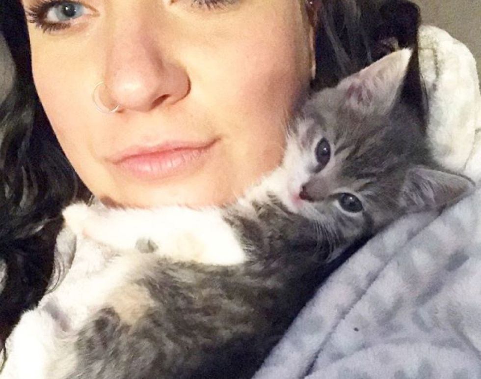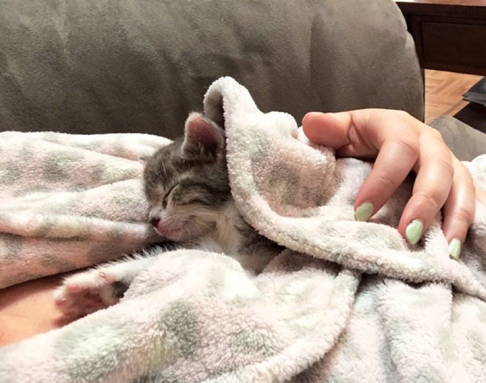 ▼他們給小貓取名為Millie,Millie洗澡後吃飽喝足,窩在溫暖的毯子裡安心大睡。牠非常喜歡把拔馬麻的懷抱,那可愛的模樣融化了Claire和Kyle的心。
