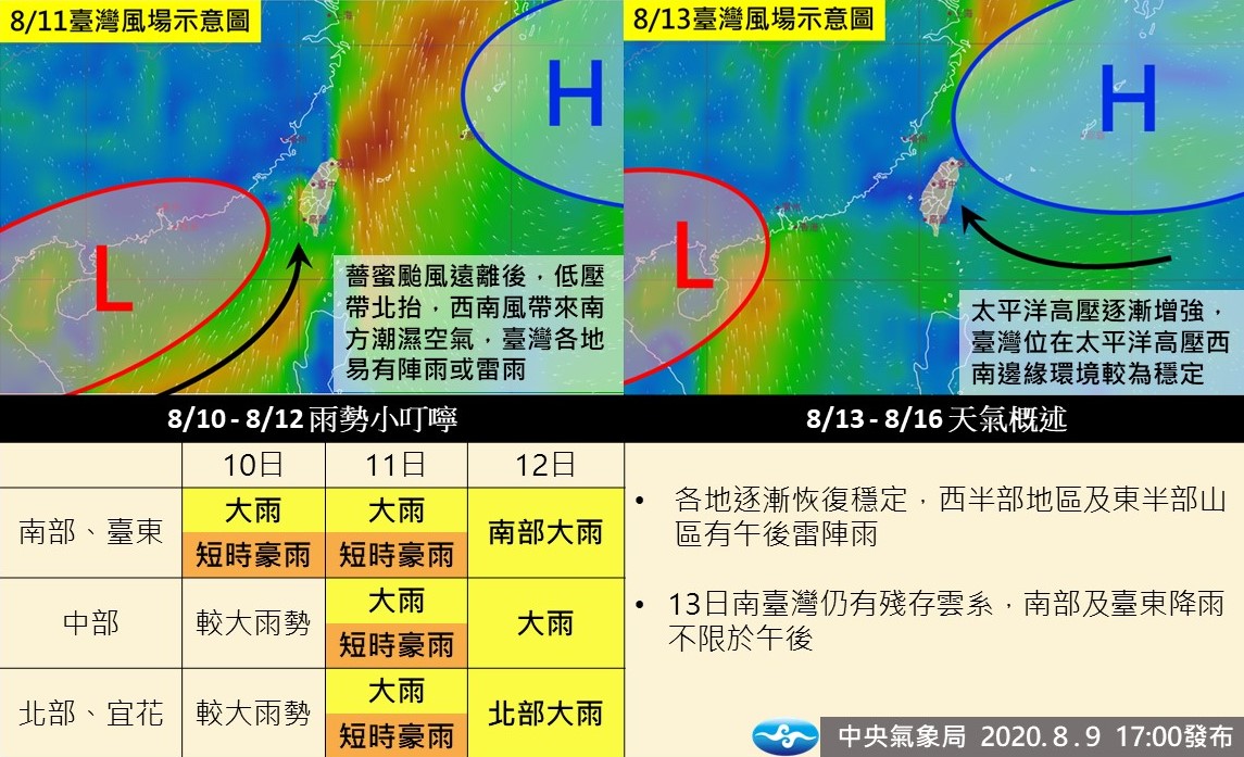 ▼氣象局預測,星期一、二會有較大的雨勢,或是豪雨,到星期三會趨緩,之後天氣會恢復晴朗炎熱,但是大氣仍不是很穩定,容易有午後局部短暫陣雨或雷雨的機會。10日會先從南部、台東出現較大的雨勢,且降雨時常較長;11日不再只是南部,全台都會有顯著的降雨,並要留意豪大雨發生的機率;12日低氣壓減弱,全台整體雨勢趨緩,西半部還是有大雨出現的機率;13日之後因為太平洋高壓的威力增強,天氣稍稍恢復穩定,但是南部、台東因為受到海面雲系的影響,降雨會不限於午後。