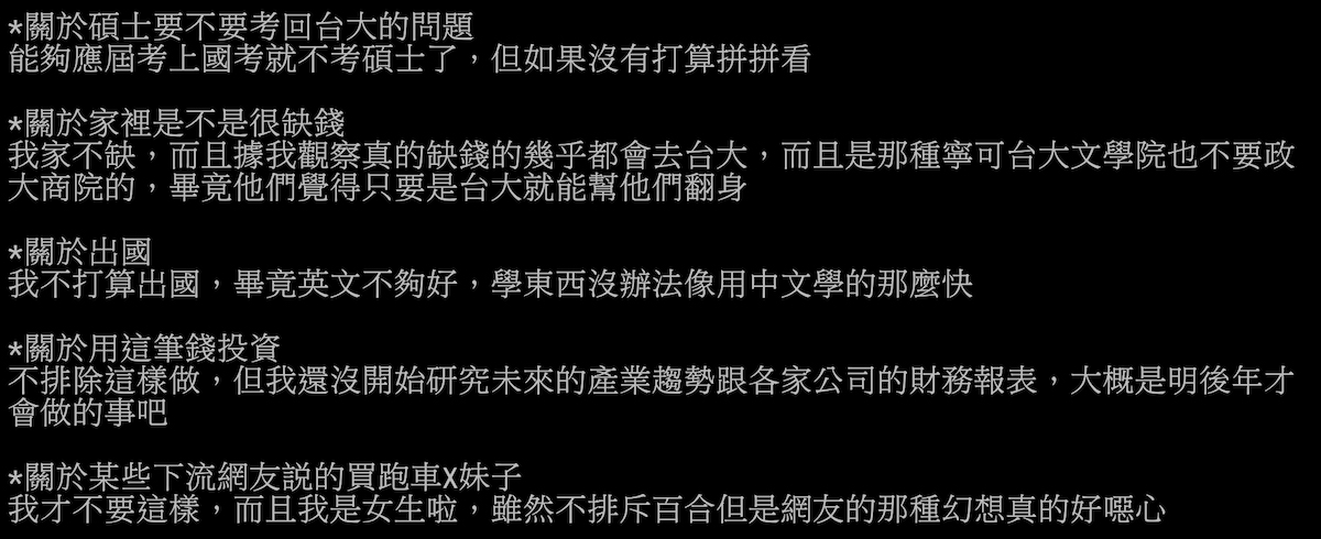 5.關於家裡是不是缺錢,她表示自己家裡不缺,並表示真正缺錢的會選擇去讀台大。