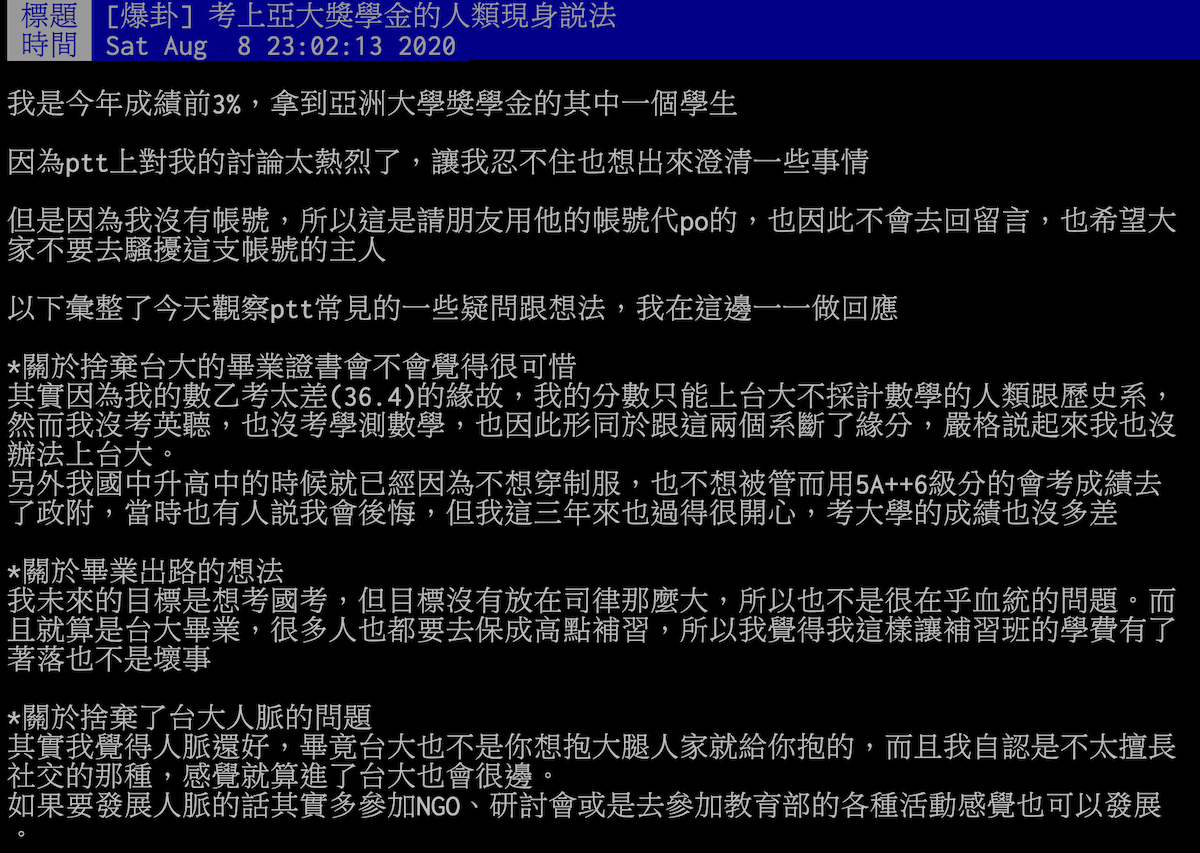 2020年08月11日最近大學指考放榜了,有2名成績優異的考生,因為優渥的360萬獎學金,選擇不讀台大而進「亞洲大學」就讀,消息一曝光後,讓許多網友都充滿了好奇,其中也有網友質疑這樣的選擇「不值得」,於是有一位當事人考生親自上PTT論壇發文回覆這些網友,分享自己之所以這麼做的原因,並一一回應了網友的8大疑問和想法。