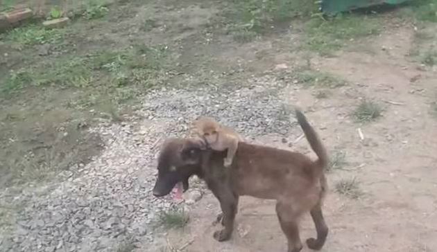 ▼小猴子趴在狗狗的背上,狗狗搖著尾巴往前跑,因為太顛簸,小猴差點滑下去。牠努力抓著狗狗的身體,就像趴在媽媽背上一樣,堅決不放開狗狗。