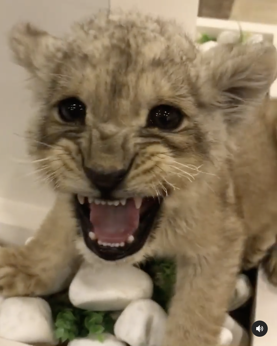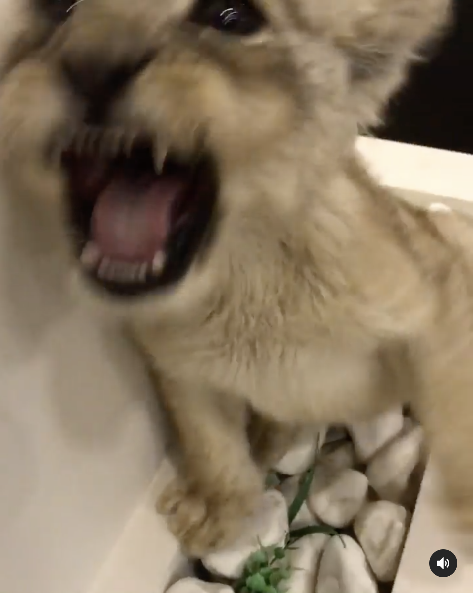 ▼臉上露出兇猛的表情,露出尖尖的牙齒,試圖逼退膽敢「摸頭牠」的人類,但是當牠發出「哇哇」的小奶音時,跟一般獅子威猛的形象好像有點不符。