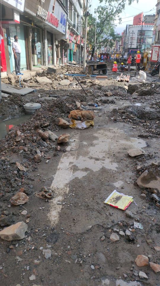 ▼照片中,在一片狼籍滿是泥濘、碎瓦的道路建築工地中,需要仔細定睛看,才能發現原來路上躺臥著一隻土黃色的浪汪媽媽,而浪汪媽媽底下則是嗷嗷待哺的小狗狗們,汪汪們身上都是髒髒的泥沙,沈睡的樣子看起來相當疲憊。