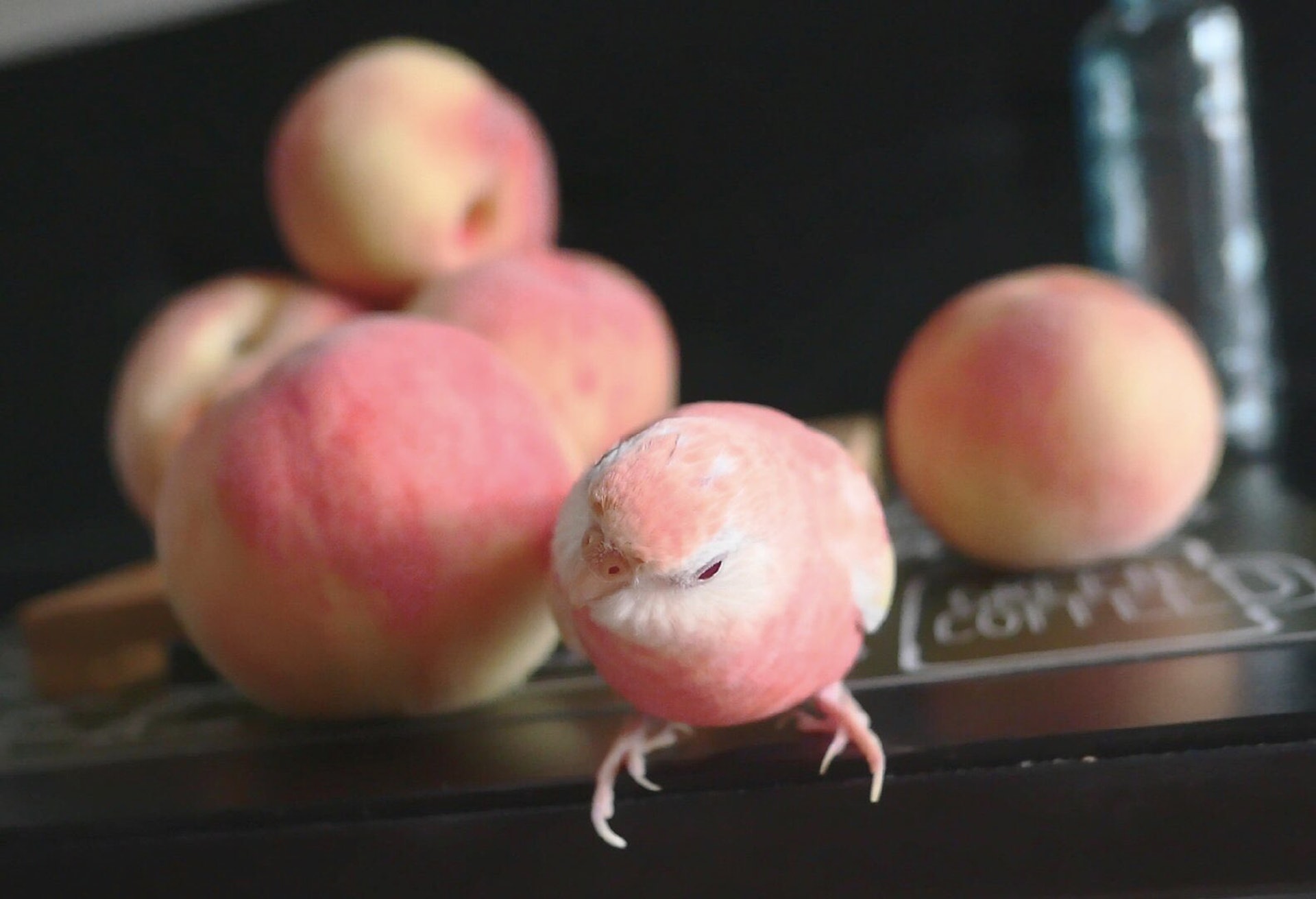 ▼這隻小鸚鵡全身粉紅色的羽毛,看起來就像一顆飽滿的水蜜桃。推主也發現了這一點,特別買來幾顆水蜜桃,當成道具給小鸚鵡拍照。