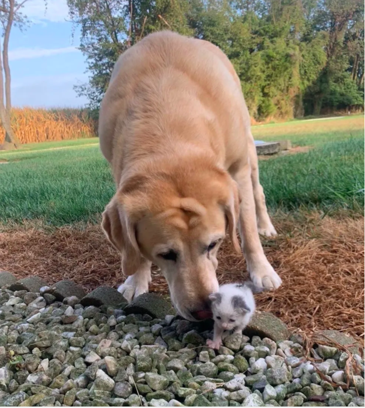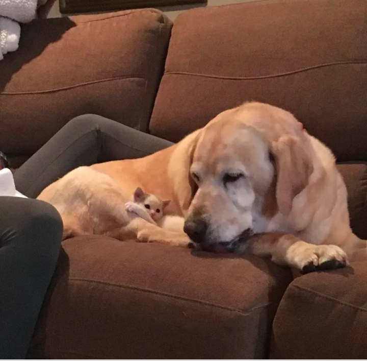 ▼從那天開始,Paxton就將Polly當成自己的小孩來照顧。牠堅決不離開這隻小貓,每次Morgan給小貓餵奶後,牠還會耐心給貓咪舔毛。
