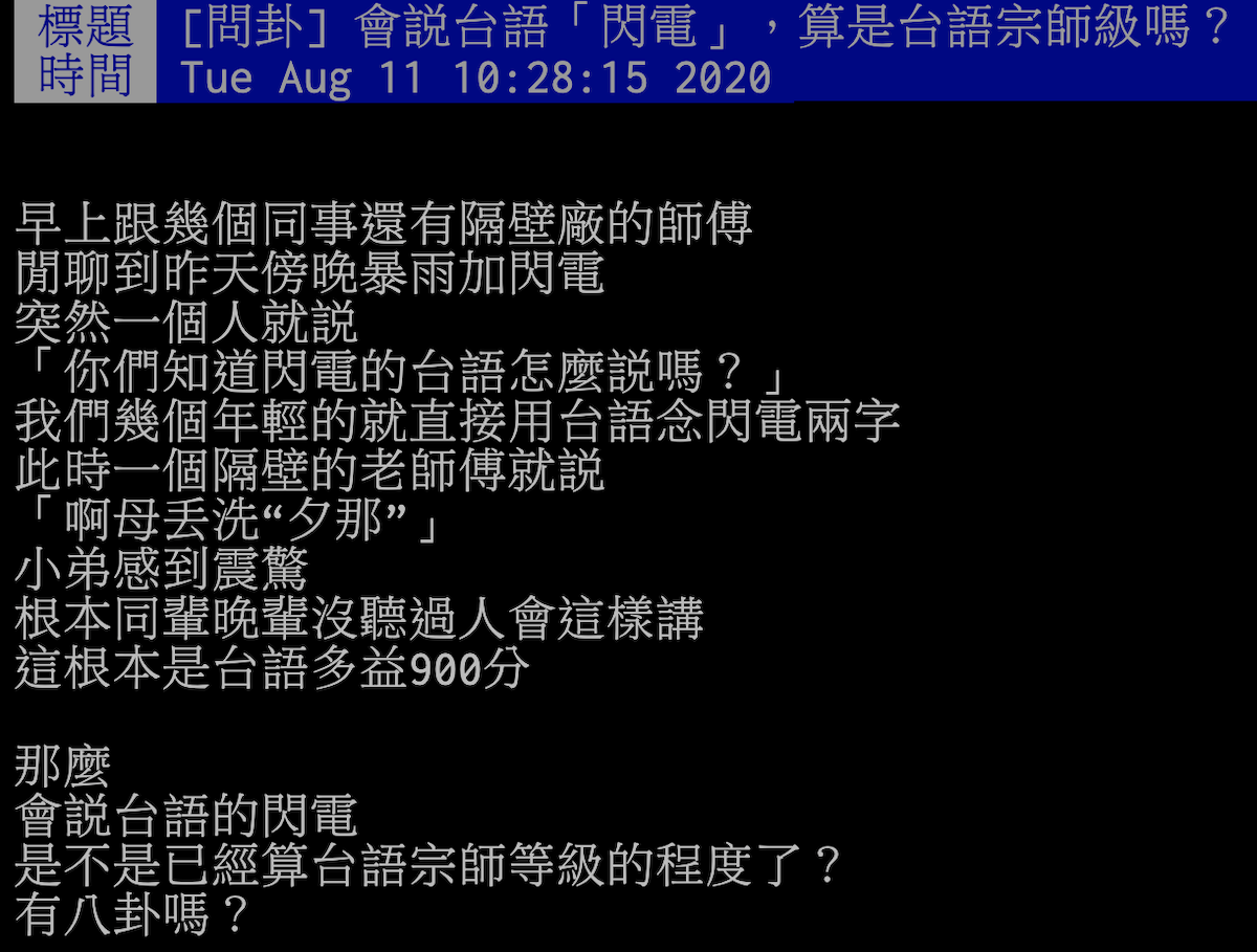 ▼原PO在網路論壇PTT八卦版上發文分享,在與同事閒談時聊到「閃電」的台語說法,當大家都一籌莫展時,唯獨只有一位老師傅回答出「夕那」(sih-nà),讓他十分驚訝,因為在同輩、晚輩中從來沒有聽過這種說法,因此讓他感到相當佩服,表示「會說台語的閃電,是不是已經算台語宗師等級的程度了?」