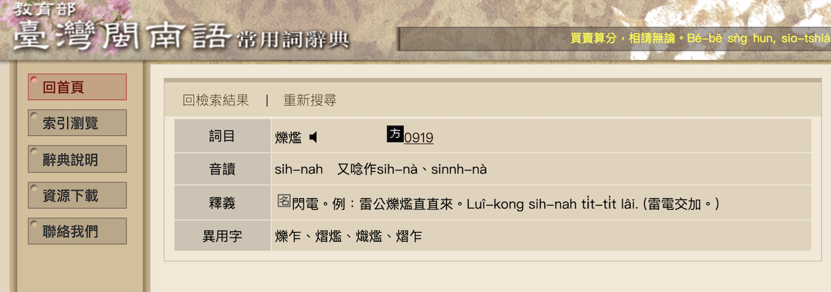 ▼其實教育部有提供了一個「台灣閩南語常用詞辭典」網站,可以在上面查詢不會的台語詞念法,並且可以聽發音。例如「閃電」經過查詢的結果顯示為「爍爁」,音讀為「sih-nah,又唸作sih-nà、sinnh-nà」,大家可以參考看看。