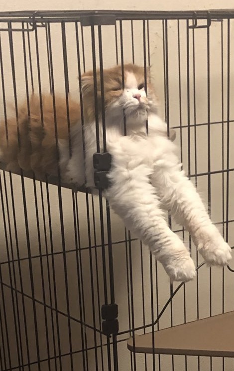▼只見這隻小橘貓爬在籠子上,臉塞在籠子的縫隙裡,臉頰上的肉肉都被卡成一團,看起來充滿喜感。推主覺得這一幕很有趣,於是將照片po到推特上,並說:「這張照片太棒了!我希望大家都能看到…」