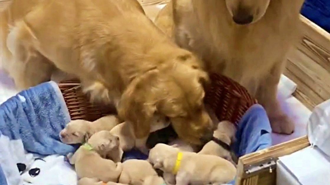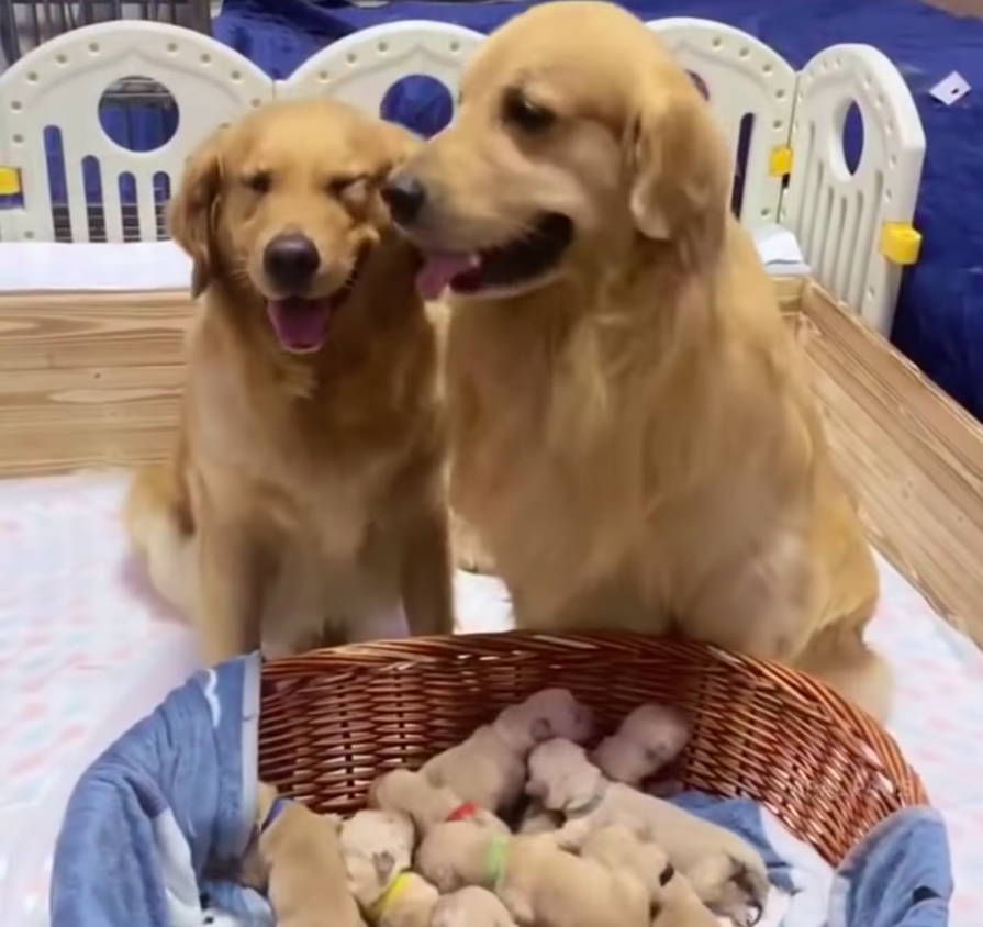 ▼育兒過程中金金把拔一直陪在金金馬麻身邊,這對相愛的夫妻將寶寶們放在中間守。小狗們喝奶時金金把拔也守護在牠們旁邊。