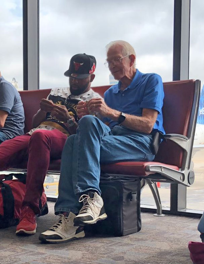 ▼這位老先生正在教導年輕人如何用紙鈔摺出紙鶴。