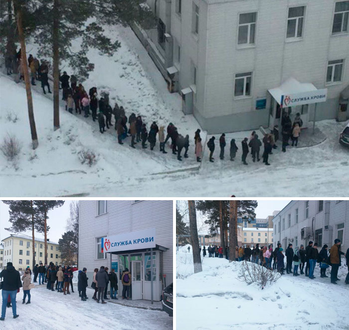 ▼百貨公司發生大事件,許多人都受到影響。俄羅斯人自願排隊捐血,為還活著的人集氣加油。