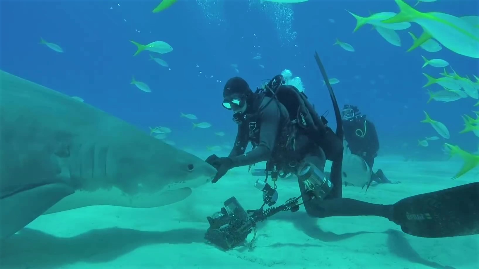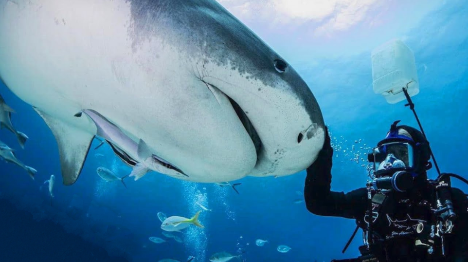 ▼2000年時Jim到巴哈馬群島研究海洋生物,那裡是著名的潛水勝地,還有很多虎鯊。有一天Jim潛水時,一隻虎鯊突然朝他游了過來,不過游了一小段距離就離開了。Jim注意到,這隻虎鯊約有5公尺長,在這片海域中幾乎是體型最大的鯊魚。他對虎鯊的行為很感興趣,想要靠近觀察,又怕驚擾牠,只能遠遠看著。