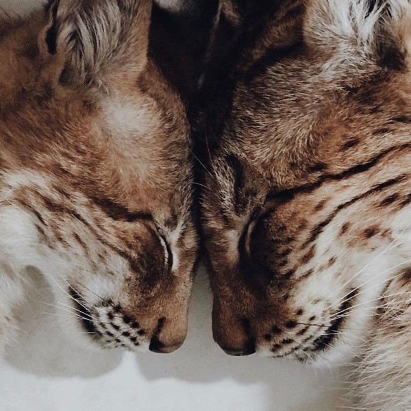▼Geralt一歲大時,Anastasia又救出了另一隻叫Bulochka的母猞猁寶寶。Geralt非常喜歡這個妹妹,每天都跟妹妹膩在一起,兩隻猞猁一起玩耍、一起嬉鬧,尤其喜歡玩「碰頭」的遊戲。Anastasia忍不住笑說:「這就是牠們最愛玩的遊戲!」