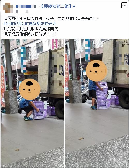 ▼正值活潑好動的年紀,又遇到期待已久的暑假,多數小孩應該都只想待在冷氣房裡玩電動看動漫吧!但男童卻十分懂事地陪著爸爸送貨,在一旁擔任小幫手,這貼心的舉動讓網友都紛紛留言讚許:「這孩子很懂事」、「覺得很懂事,同學暑假在玩game,而他是在暑假充實自己」、「很棒的孩子,還會幫家人分擔工作」。