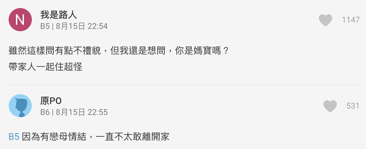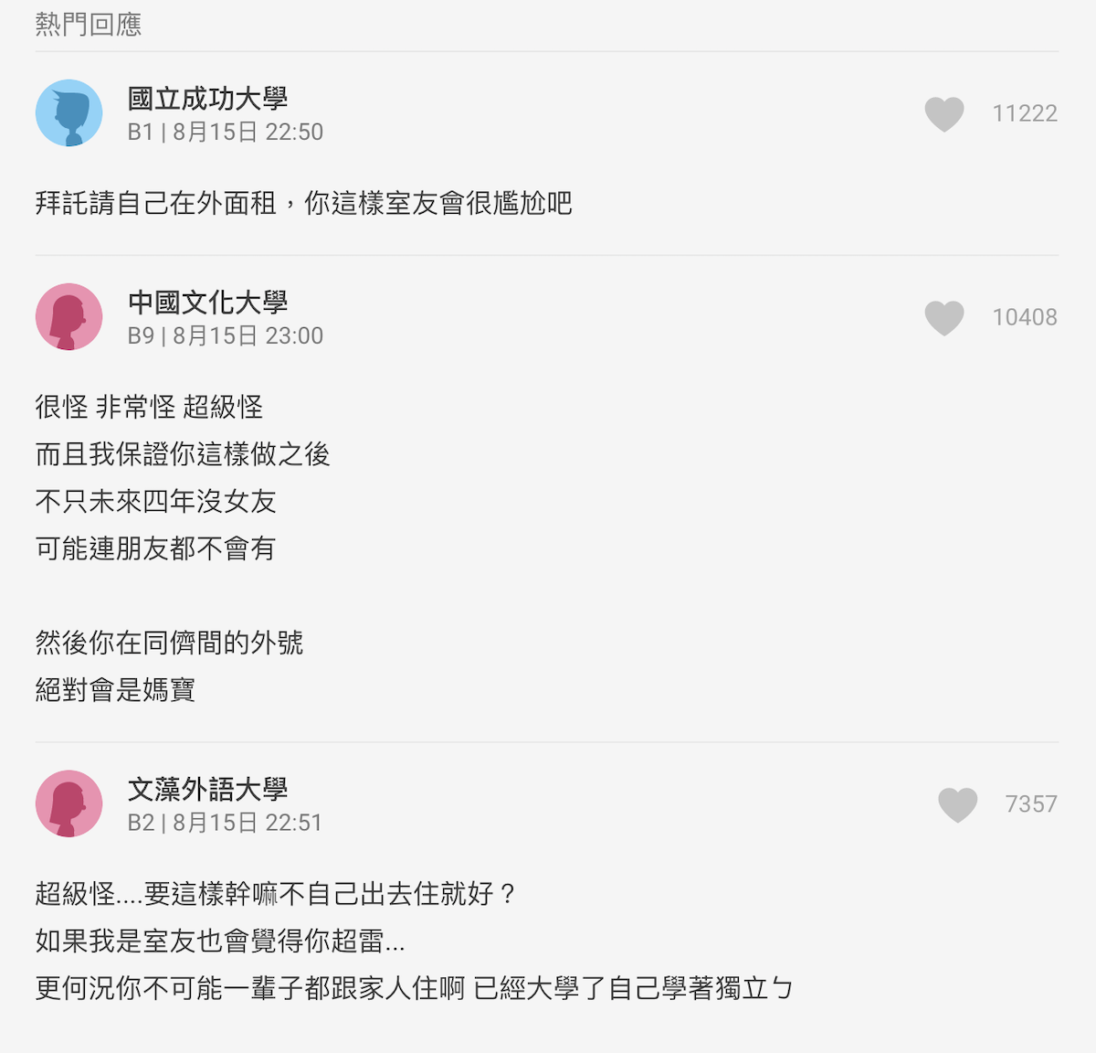 ▼網友看到這篇文章後,紛紛表示「拜託請自己在外面租,你這樣室友會很尷尬」、「很怪、非常怪、超級怪」、「如果我是你室友也會覺得你超雷…更何況你不可能一輩子都跟家人住啊」、「你以後上課媽媽也要一起去上課嗎?而且媽媽一起住男生宿舍,室友應該會覺得很可怕」,更有網友直言詢問:「你是媽寶嗎?帶家人一起住超怪」,而原PO更坦言回:「有戀母情結」。