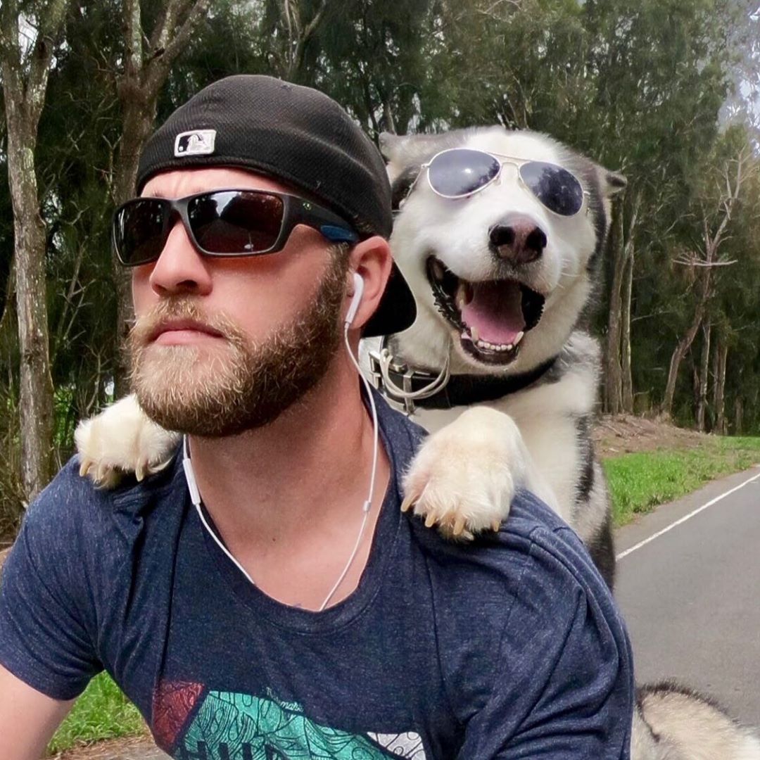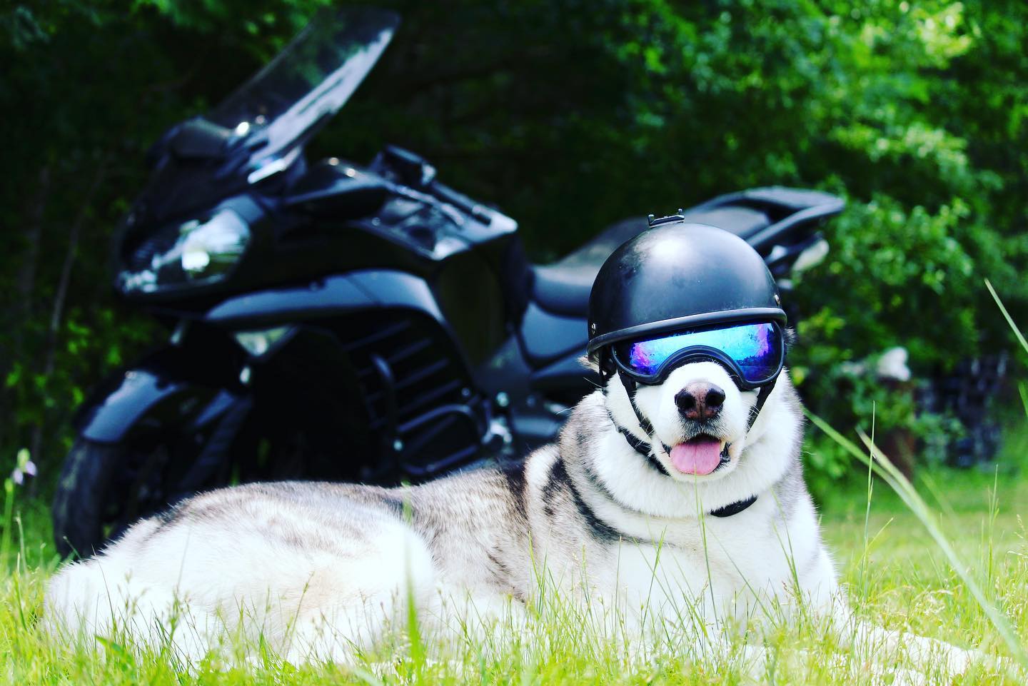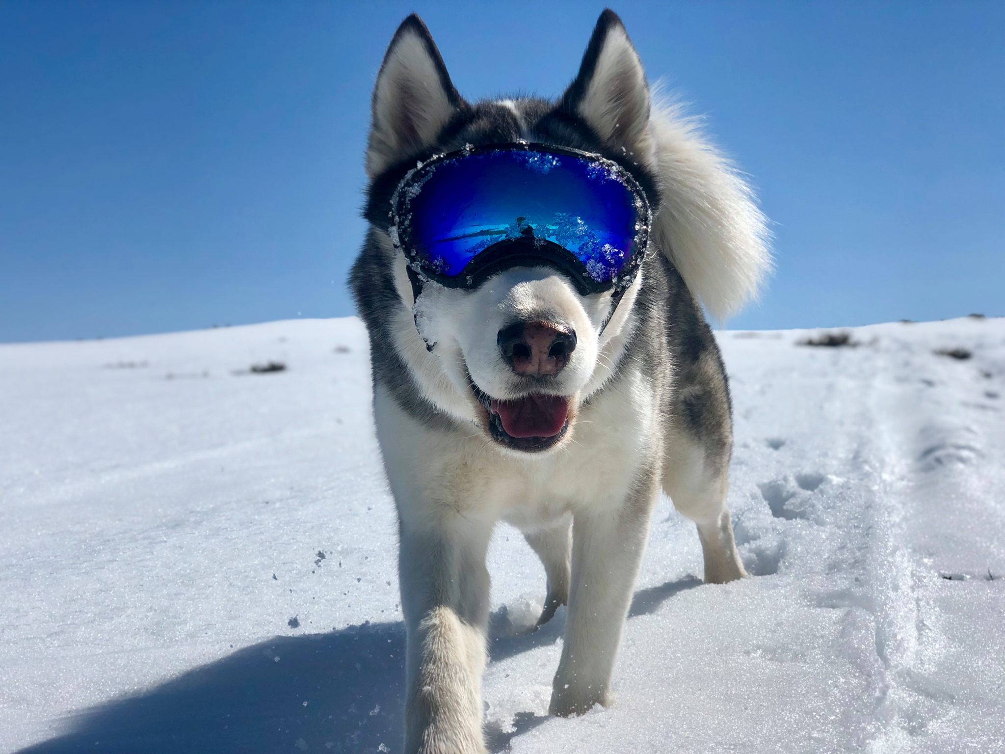 ▼戴上安全帽和護目鏡的Sox是全世界最帥的哈士奇,但摘下來後…牠頭上的毛色有點特別,看起來就像禿頭。