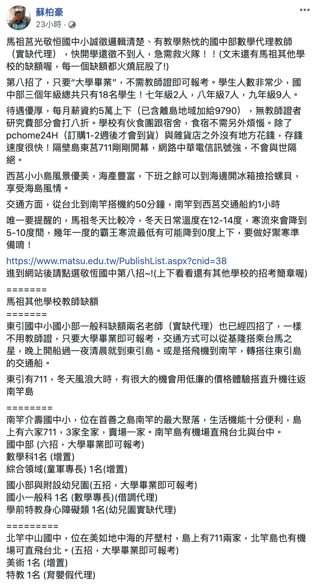 ▼馬祖鄉親協會理事蘇柏豪PO文表示,馬祖西莒島的莒光敬恆國中小學急缺代理教師,因為到第8招了,所以只需要大學文憑、不需要教師證就可報考,並透露學生人數非常少,國中部3個年級總共只有18名學生。待遇方面每個月加上離島地域加給約有5萬元上下,沒有教師證研究費會折8折,並且學校有提供伙食團和宿舍,食宿方面都不需要另外煩惱。