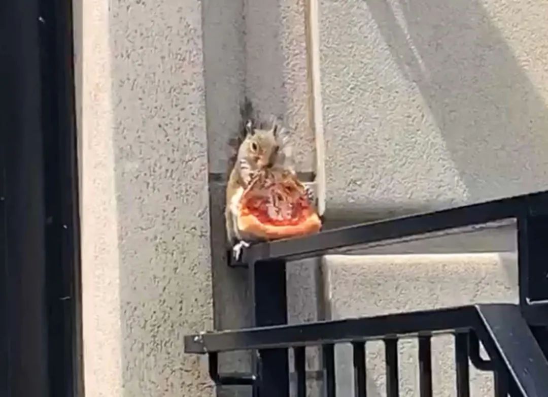 路邊看到小松鼠吃飯…走近一看竟在吃「肥宅快樂餐」:披薩整片叼著走~