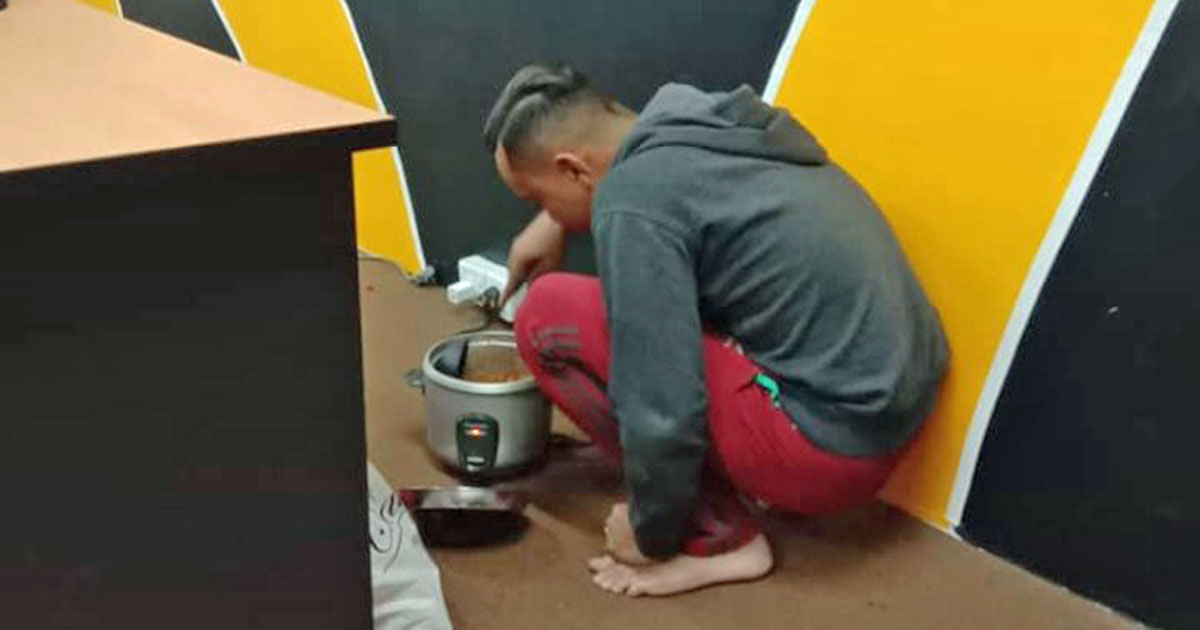 ▼那天晚上Azri去公司時已經很晚了,員工們早就下班了,按理來說公司裡應該已經沒人才對,但辦公室裡的燈還亮著,甚至隱約能看到晃動的人影。Azri覺得很奇怪,悄悄走過去查看了一下。Azri走上前才看到19歲男員工Habil正蹲在地上煮飯!Habil偷用公司的電被老闆抓包,感覺非常緊張,也非常尷尬。他連忙解釋說:「對不起,我一整天沒有吃飯,正準備要煮飯吃。」