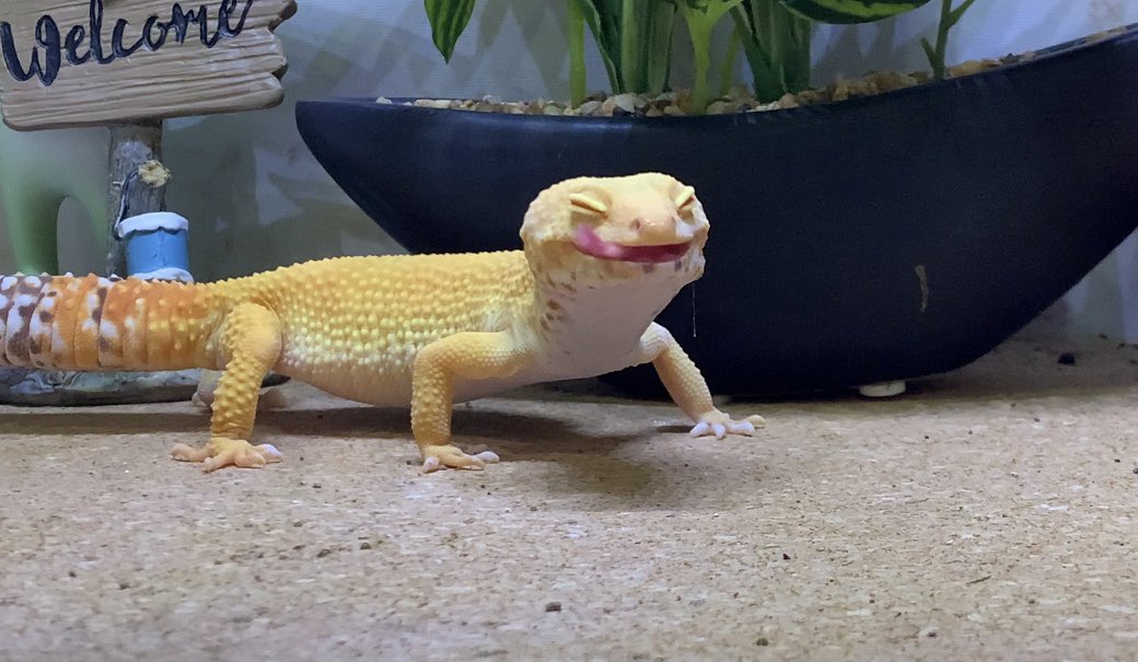 豹紋壁虎身上的花紋跟豹紋很像,牠們溫馴可愛,是很受歡迎的爬蟲類寵物。推主家的這隻豹紋壁虎是橘化品系,而且有特地選擇繁殖,身上才沒有黑色斑點,而是可愛的橘黃色。小壁虎瞇眼憨笑吐舌的模樣超療癒啊~