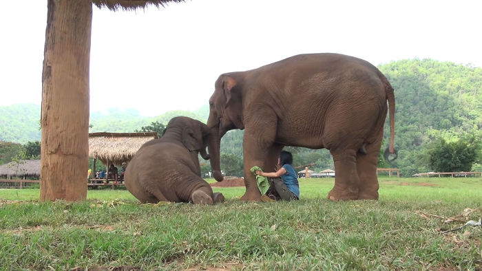 ▼Lek Chailert跟著大象來到旁邊的草地上,只見Faa Mai收養的小象Thong Ae也在那裡。原來母象是要Lek Chailert給小象唱搖籃曲,哄牠入睡,就像以前給自己唱搖籃曲,哄自己睡覺一樣。