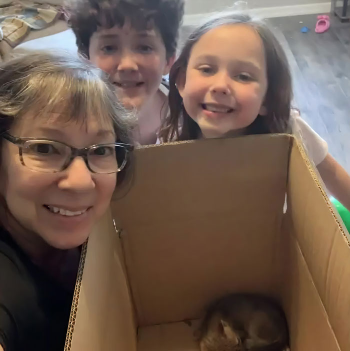 ▼Caballero一家找來一個箱子,在不用手直接碰觸的情況下將小狐狸裝進箱子裡。他們把虛弱的小狐狸送到野生動物保護中心,工作人員表示,這隻小狐狸只有1個月大,體長約20公分,成年人可以用單手將牠捧在手上。