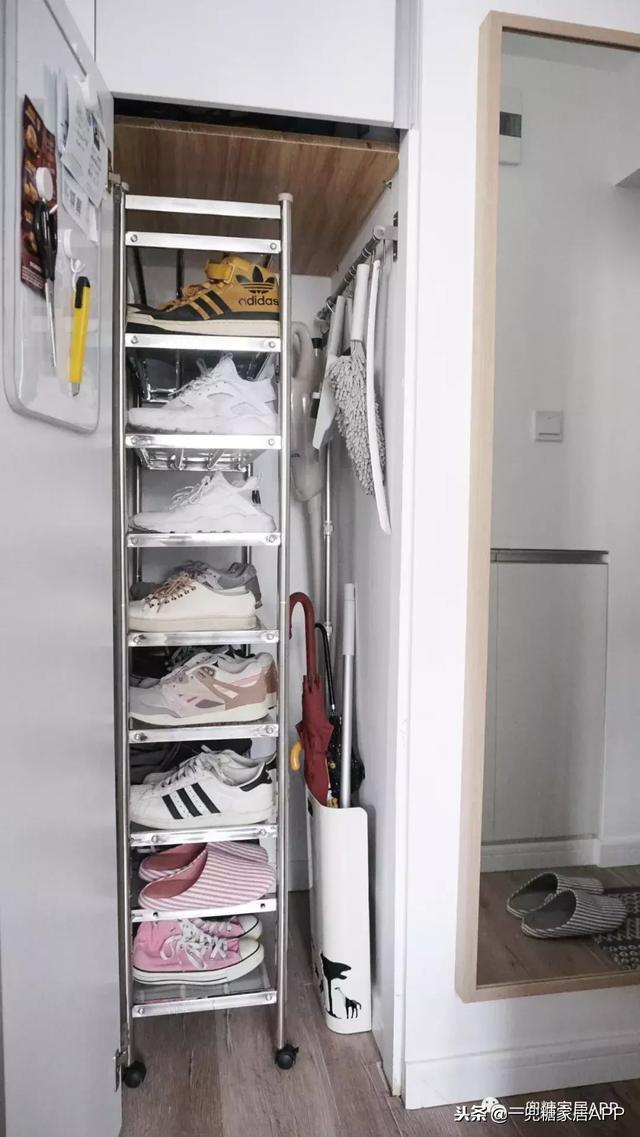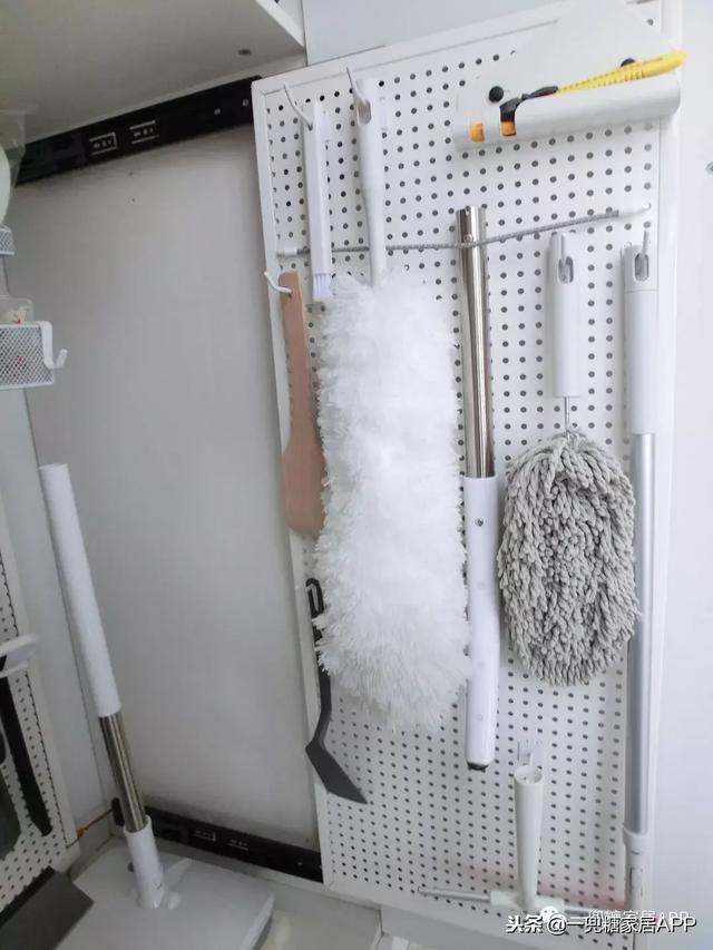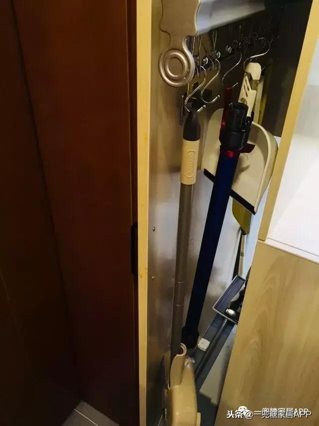 ▼2.在玄關裝25cm窄櫃,搭配可推拉掛桿:這個戶型的玄關比較小,留出了一個25cm的薄櫃,能夠用來收納清潔工具。櫃門在正面,方便取放工具;加上可推拉掛桿後能收納更多工具。