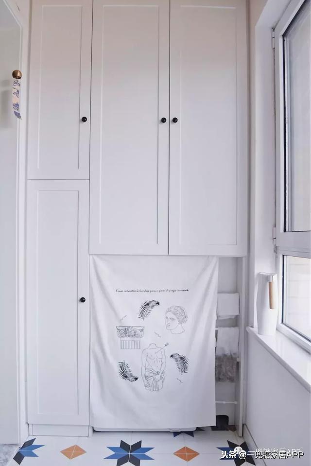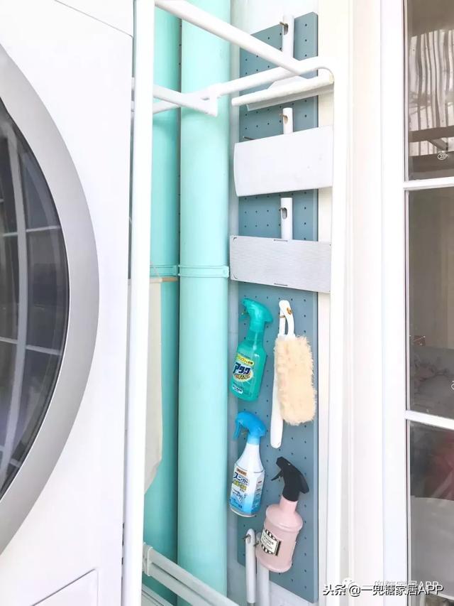 ▼12.陽台管道也能收納:陽台不包管不好看,但這位屋主卻把管道刷上清新的漆,省出空間來裝清潔工具。