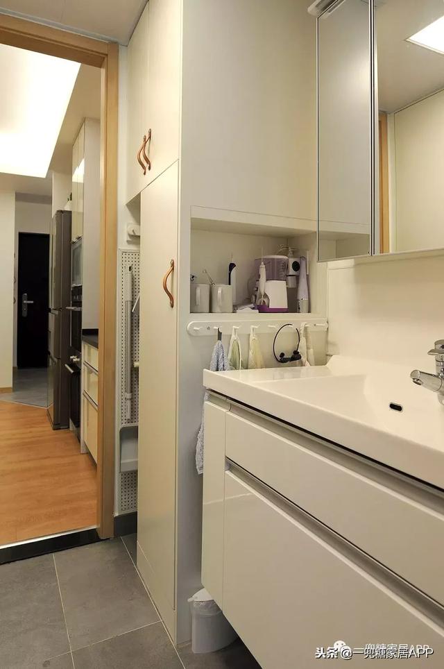▼11.廁所的過道拿來收納:狹窄的過道也能拿來收納清潔用品,這位屋主在廁所干區和廚房之間的過道設立頂天立地櫃,其中一個開放格用來收納清潔工具。用洞洞板、長鉤擴容,空間立刻增加好多。