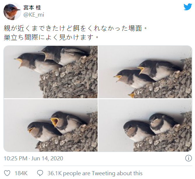 2020年08月31日媽媽怎麼飛走了?日本攝影師宮本桂最擅長拍攝野生鳥類,經常能拍到有趣的畫面。日前他就捕捉到了鳥媽媽和鳥寶寶們的可愛互動。當時胖乎乎的雛鳥待在巢裡,等著媽媽來餵食,沒想到鳥媽媽飛回來後卻「過家門而不入」。鳥寶寶們傻眼的表情都被拍下來,網友們看到後都笑翻了~